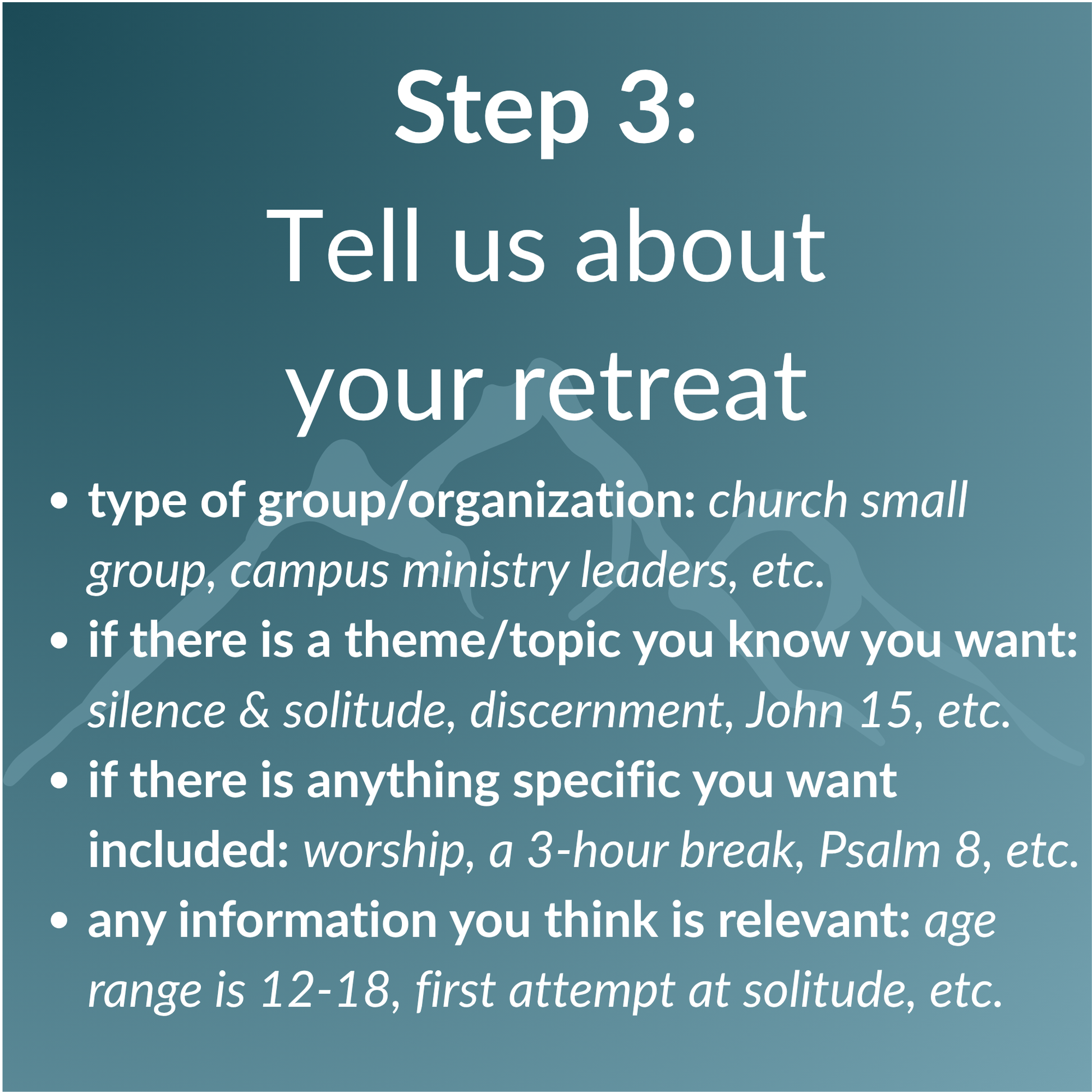 Step 3: In the box below, tell us about your retreat. Please include: